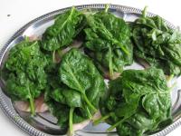 Mehrere Spinat-Blätter aufeinander legen. Jeden Schnitzel umstürzen und mit einem Stocher verbinden.