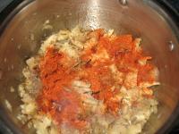 In einem Topf Öl erhitzen lassen, den Austernpilz reinlegen, salzen und mit Pfeffer und Kümmel bestreuen. Ein paar Minuten den Austernpilz dünsten lassen. Paprika dazugeben und gut durchrühren.