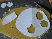 Schwarze Mischung auf Arbeitsbrett mit Maisstärke bestreut ausrollen. Augen und oberen Teil von Ohren ausschneiden.
