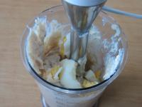 Eier hartkochen, kühlen, schälen. Zwiebel schälen, schneiden und fein zermixen.