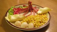 Würstchen 1 Stück • Emmentaler 5 Gramm • eingelegter Mais 30 Gramm • Paprikaschote 20 Gramm