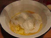 Mehl in die Schüssel geben, Eier, zerlassene Butter, Jogurt, Zucker, eine Prise Salz zugeben.
