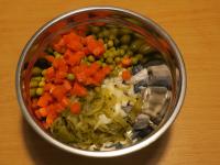 In Schüssel mit Fischen Zwiebel, Gurken und abgeseihten Erbse mit Möhre zufügen.