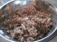 Das Öl aus der Dose entfernen. Den Thunfisch in eine Schüssel geben, die gereinigte und fein gehackte Zwiebel hinzufügen, mit gemahlenem schwarzem Pfeffer würzen, mit dem Saft einer halben Zitrone würzen und mischen.