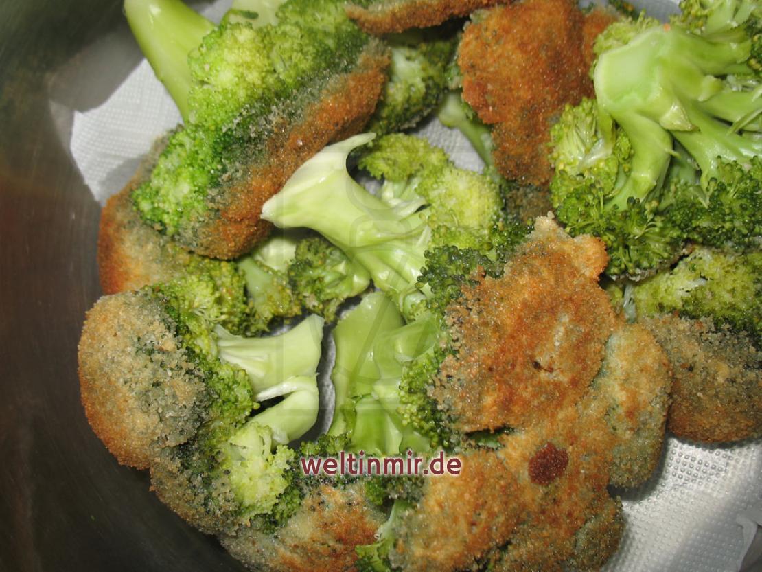 Den Brokkoli kurz in heißem Öl anbraten und nur diesen Teil, den in Semmelbrösel gewickelt ist.