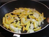 Paprika entkernen, waschen und in Streifen schneiden. Zu den Kartoffeln und Zwiebel geben und eine Minute lang anrösten.