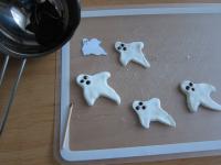 Die Gespenster je nach Bedarf fertig machen und die Augen und den Mund mit zerlassener Schokolade mit Hilfe eines Stochers zeichnen.