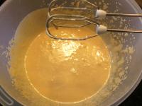 Wasser und Öl in die Eigelbe einrühren. Mehl mit Backpulver beimengen.