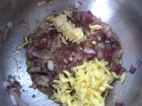 Ingwer und Knoblauch putzen und fein reiben. Sie und Chilli zur Zwiebel zugeben. Alles zusammen kurz braten.
