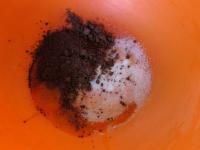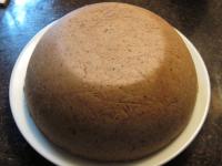 Plastikschüssel eines Durchmessers von 22 cm und Höhe von 9 cm mit einer Lebensmittelfolie auslegen. In die Schüssel gleichmäßig aufgetaute Kastanienpüree stauchen so damit die ganze Schüssel von innen bedeckt würde.