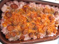 Auf die Wurst die ganze Reis-Fleisch Mischung verteilen und darauf dann die zweite Hälfte der Wurst mit Zwiebel schichten.