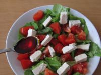 Leichtes Abendessen, aus Kopfsalat, Tomaten und Feta Käse, mit gesunden Ölen abgeschmeckt. Mit einem Stück Vollkornbrot servieren.