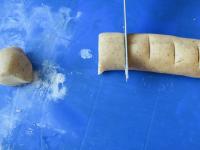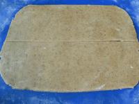 Den Teig auf ein Rechteck von 32x24 cm ausrollen. In die Viertel so schneiden, damit vier Teigteile mit Maßen von 24x8 cm entstehen.