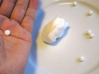 Rolle mit einer Länge von 25 cm daraus formen. Die Rolle in 1 cm lange Stücke schneiden. Die Kugeln daraus formen und in den Kühlschrank stellen.