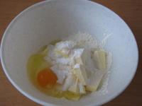 Mehl in die Schüssel geben, geschnittene Butter, etwa Jogurt, Ei und Backpulver zugeben.
