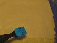 Den Teig auf dem bemehlten Brett auf die Form eines Rechtecks 32x35cm ausrollen. Den Teig mit verquirltem Eiweiß bestreichen.