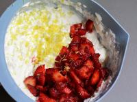Mascarpone, Zucker, Sahnestreif, Zitronenschale und Erdbeere geschnitten zugeben.