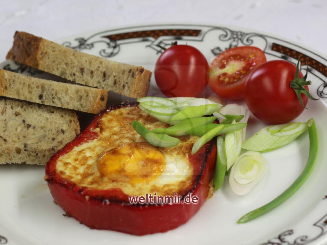 Ein einfallsreiches Rezept für die Zubereitung von wunderbaren gebratenen Eiern in ,,Paprika-Gürtel”. Ausgiebiges Frühstück ganz schnell und einfach. Servieren mit Frühlingszwiebel und süßen Cherry-Tomaten.