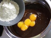 Eidotter zur Schokolade zugeben. Mehl in die Masse einmischen. Geschlagenen Schnee zum Schluss fein einarbeiten.