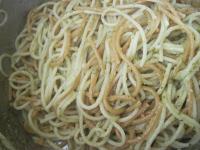 Wasser in einen Topf gießen, es salzen und zum Sieden bringen. Spaghetti in größerer Menge im Wasser kochen, damit sie nicht kleben. Wenn das Wasser kocht, Spaghetti zugeben und kochen nach angegebener Zeit an der Packung.