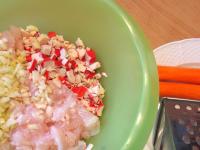 Pangasius auftauen lassen und in kleine Stücke schneiden. Zu den surimi Stäbchen geben.