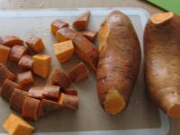 Süßkartoffeln waschen, harte Enden abschneiden (nicht schälen). In Würfel schneiden....