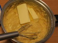 Einen dicken Pudding aus Milch, Zucker und Puddingpulver kochen.