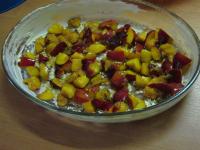 Backpulver mit Mehl vermischen, unter die Eiermasse mengen, alles zu einem glatten Teig verarbeiten und die Nektarinen damit übergießen.