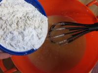 Eigelbe in Milch vermischen, zerlasene Butter und Zucker zugeben. Mehl mit Backpulver zugeben und vermischen, bis ein glatter Teig entsteht.