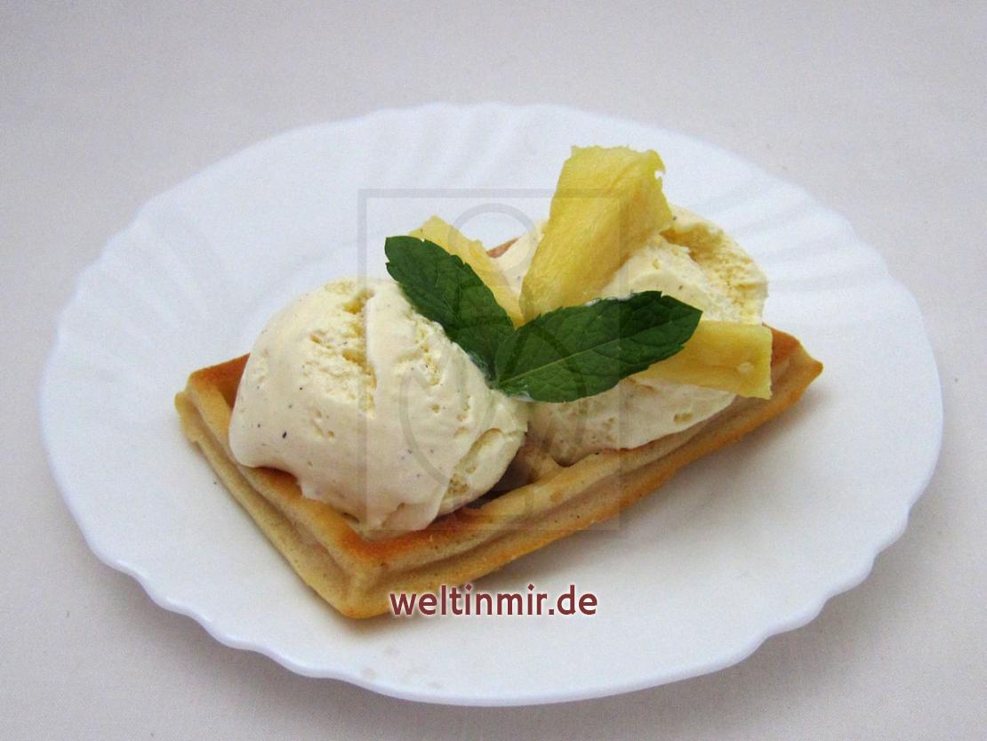 Mit Vanilleeis und Stücken von frischer Ananas dekorieren.