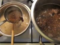 Linsensuppe (den flüssigen Teil, falls möglich) mit Schopflöffel in das Mehl eingießen und Mehlschwitze zerkochen. Mehlschwitze dann in die Suppe ausgießen und 3-4 Minuten beim ständigen Rühren kochen.